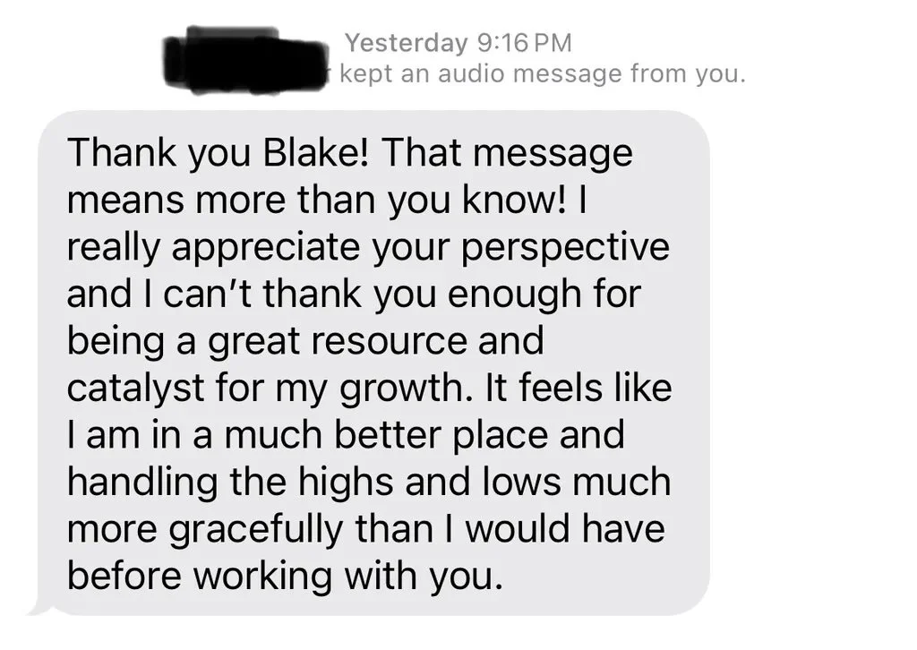 “Previous coaching hasn't been super helpful. Blake really turned that around. Using this emotionally-intelligent approach, Blake and I ended up working more on mindset, than on the goals themselves -- and the more we worked on mindset, the more those goals took care of themselves.”