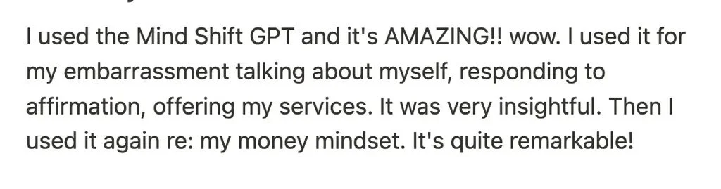 I used the MindShift GPT and it's AMAZING!! Wow. I used it for my embarassment talking about myself, responding to affirmation, offering my services. It was very insightful. Then I used it again re: my money mindset. It's quite remarkable!